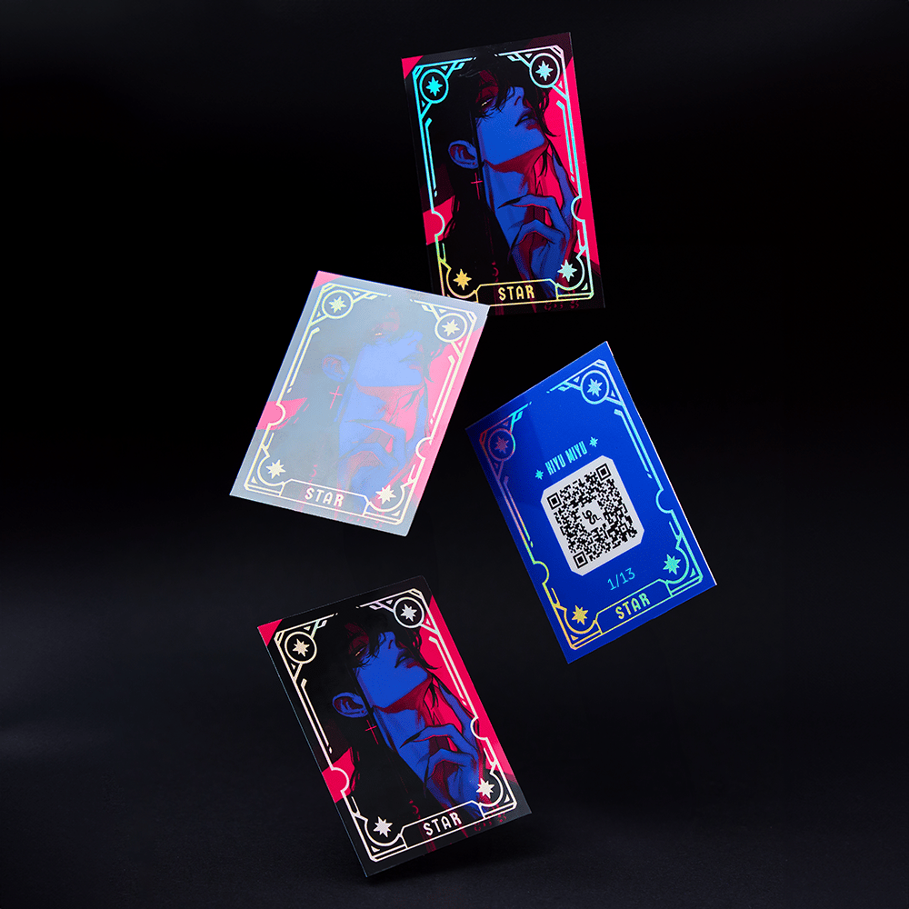 Crafted on very thick stock with a holographic frame on both sides, featuring a glossy finish and protective foil.