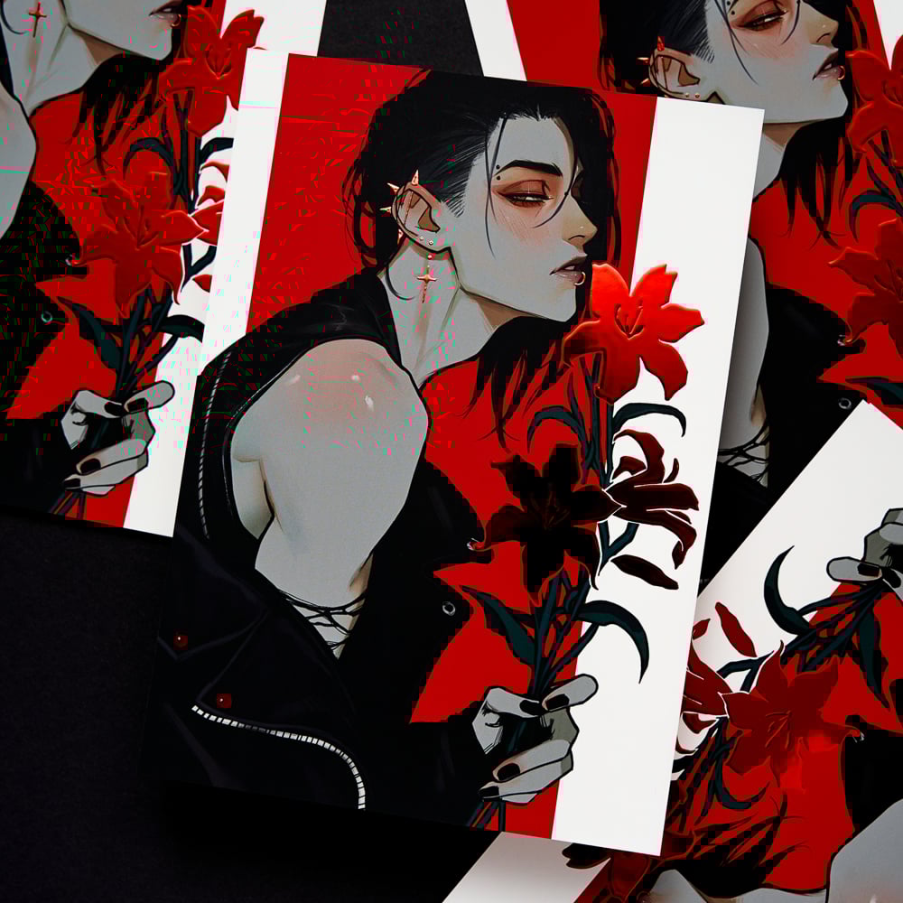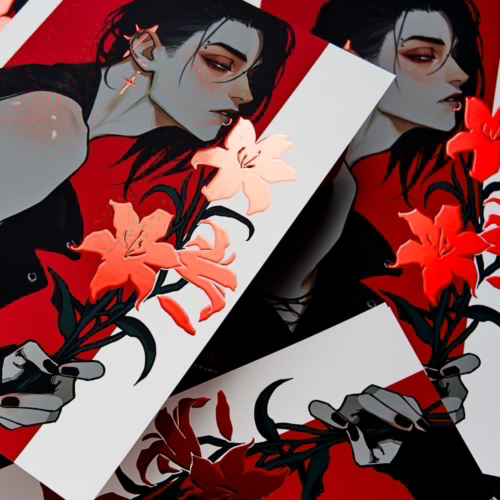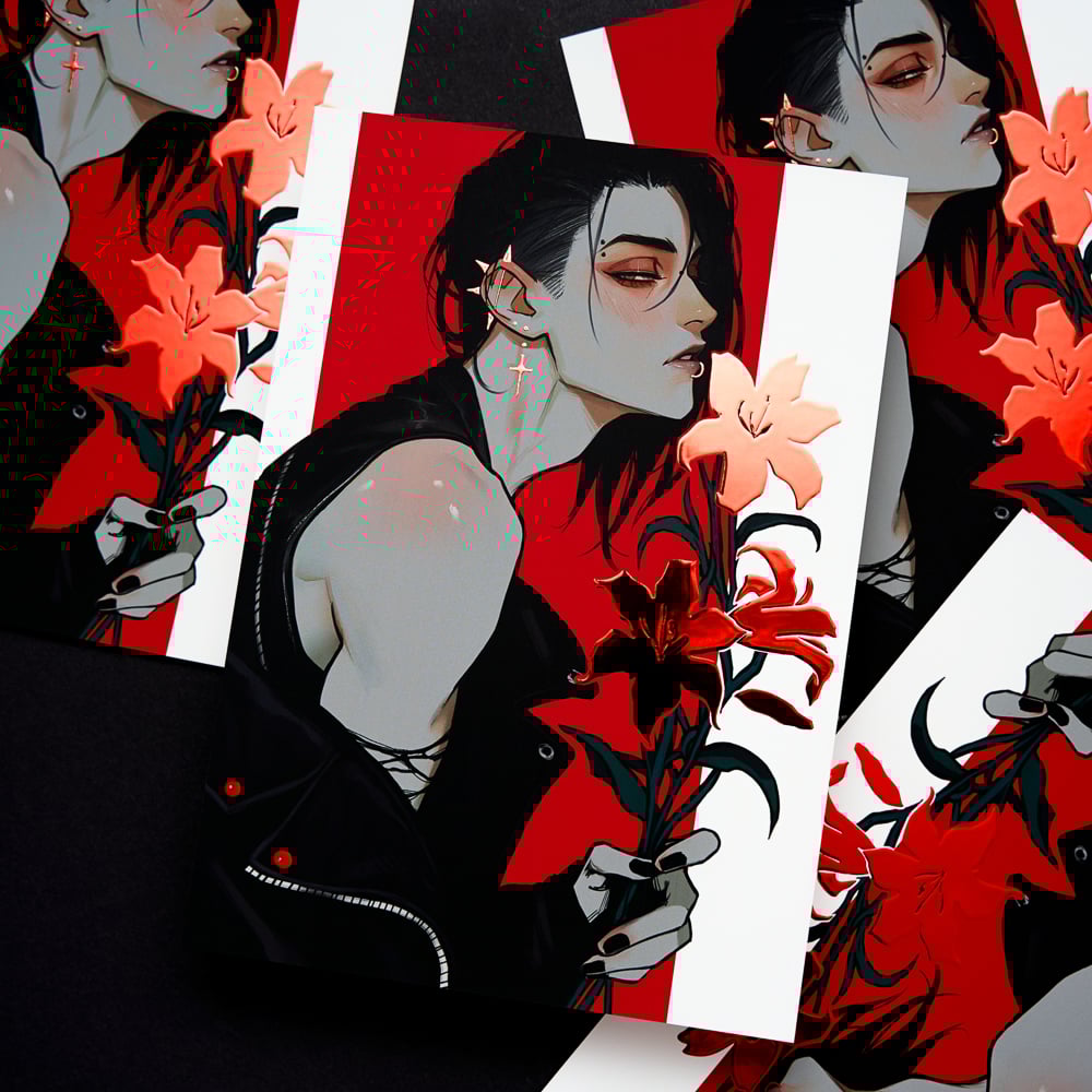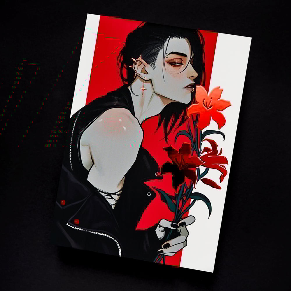 Matte print, double-sided coated with soft-touch film and embossed red foil.