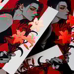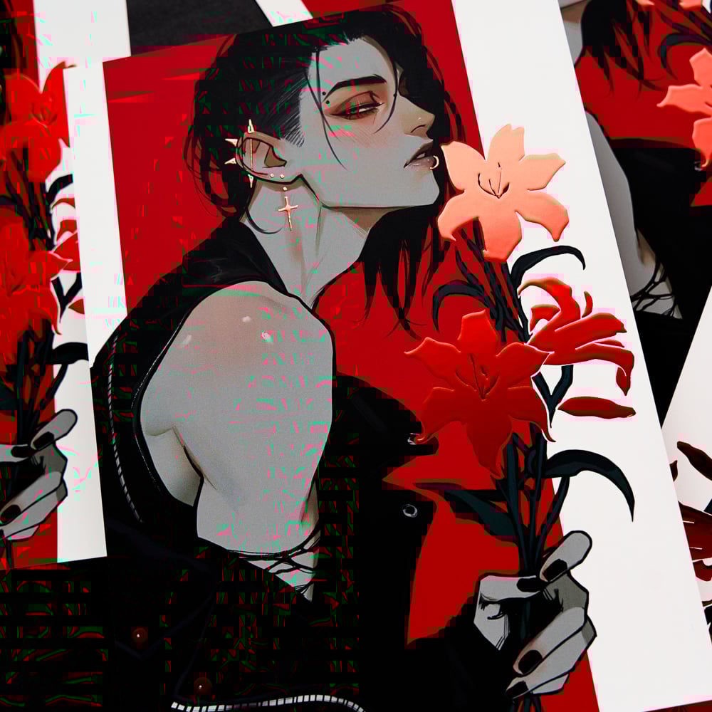 The red foil is on the flowers, earrings, and pins.
