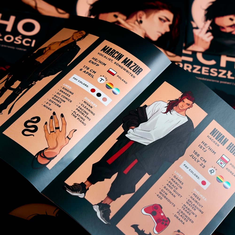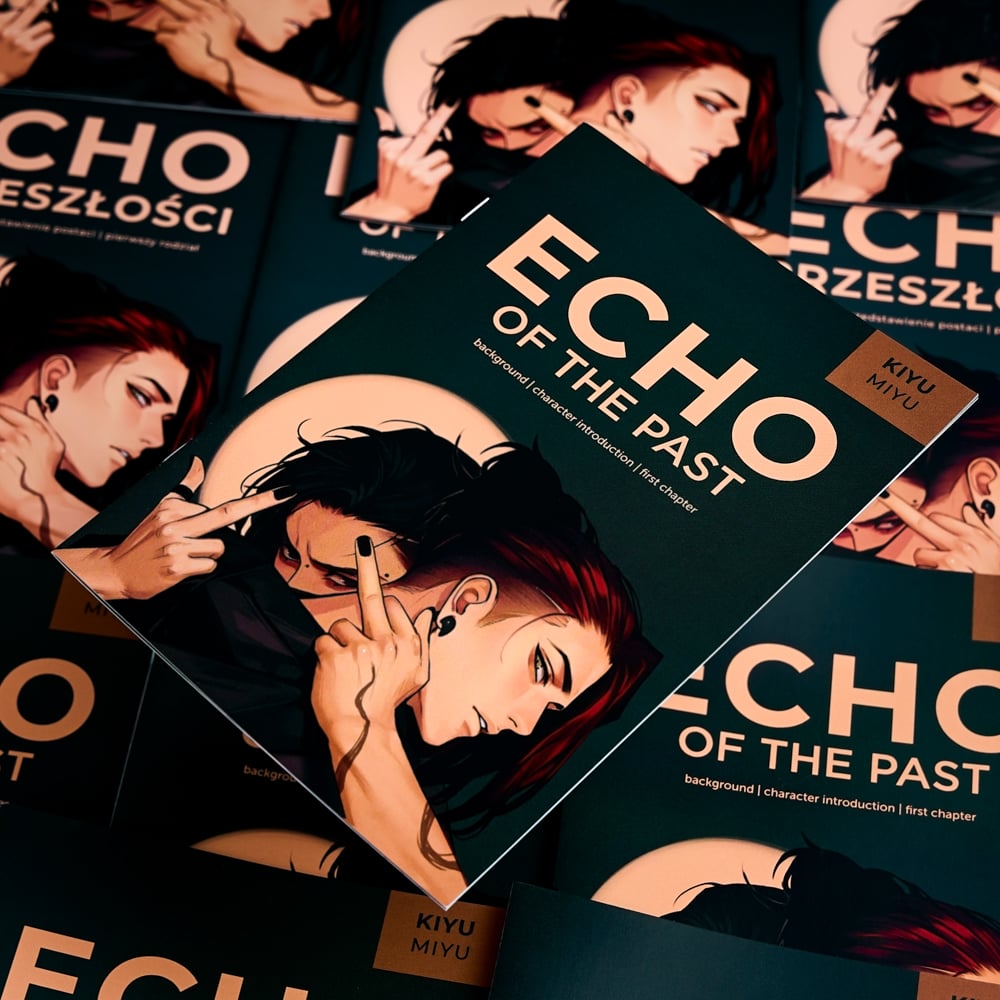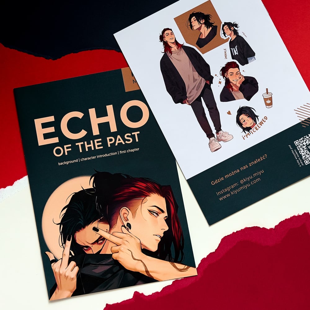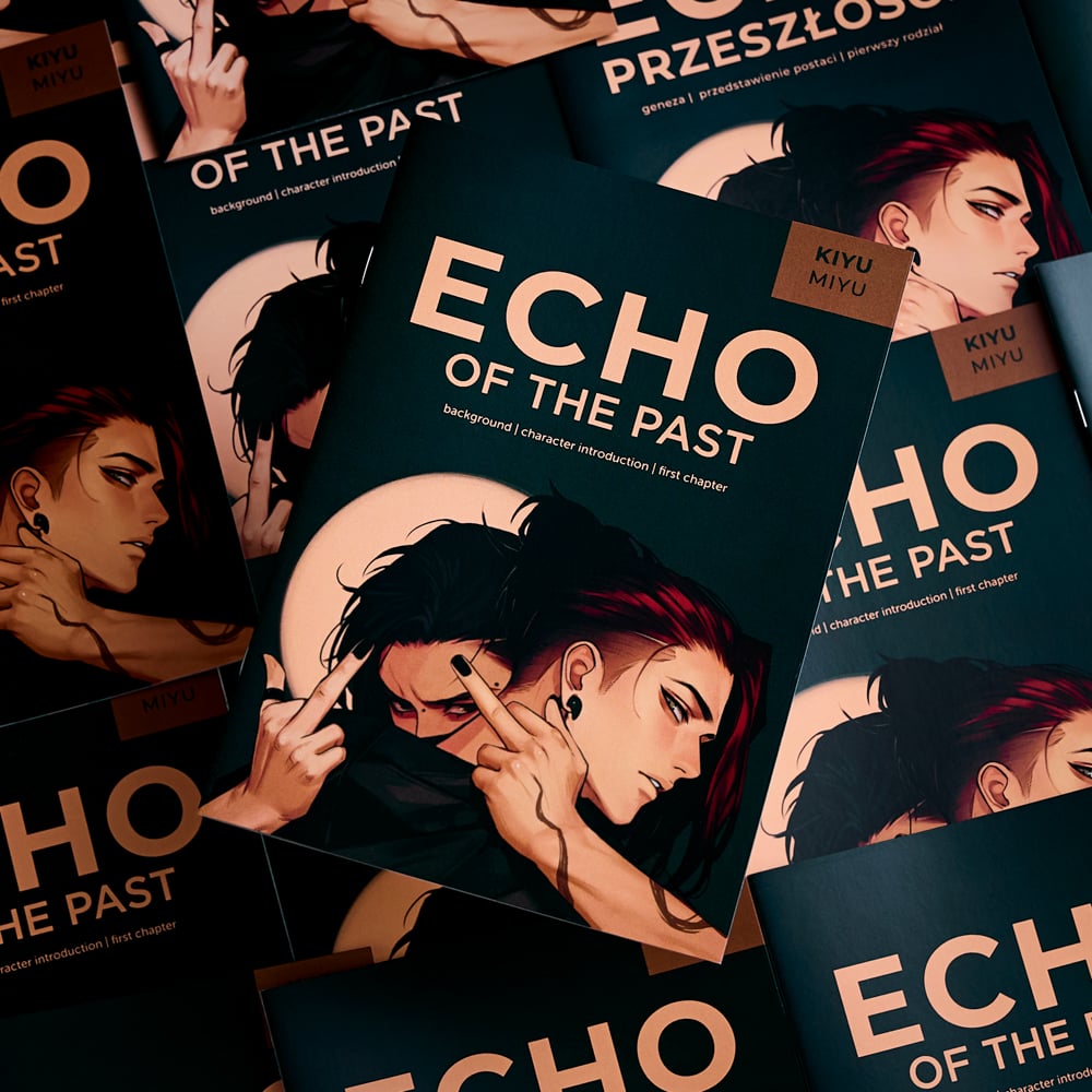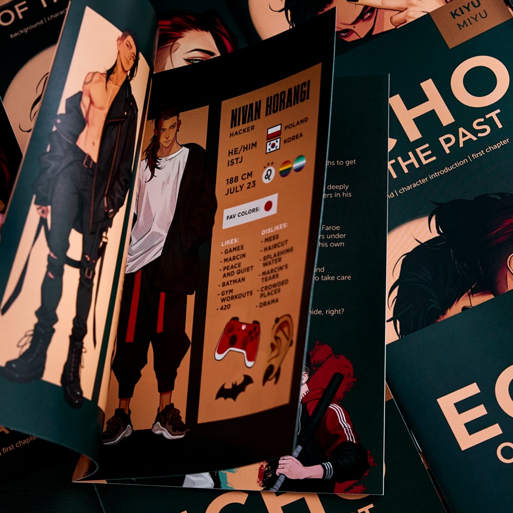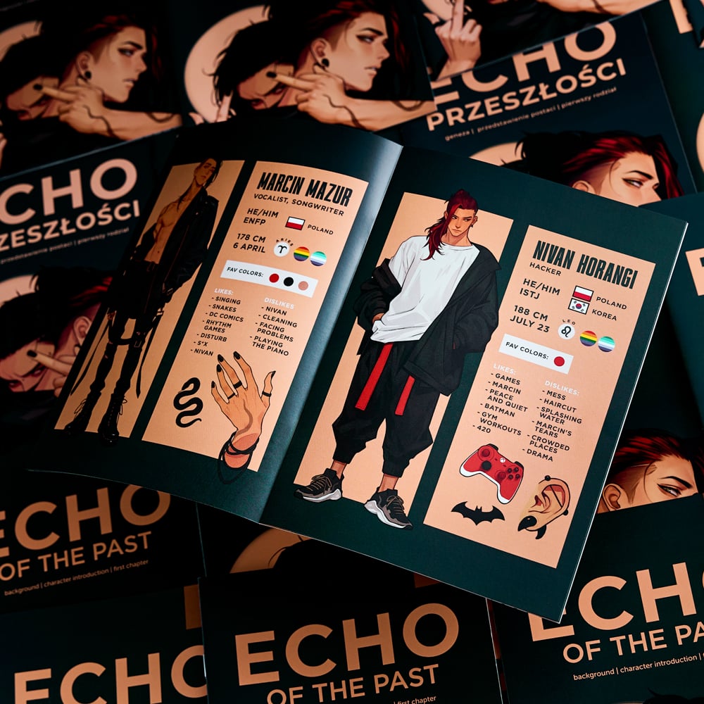 The zine consists of 12 pages. It briefly presents what my novel Echo of the Past is about and how it came to be. It introduces the characters and couples, and also includes the first chapter of Echo. It’s a small teaser - a little taste of what I hope will someday become the full published version of Echo :D
